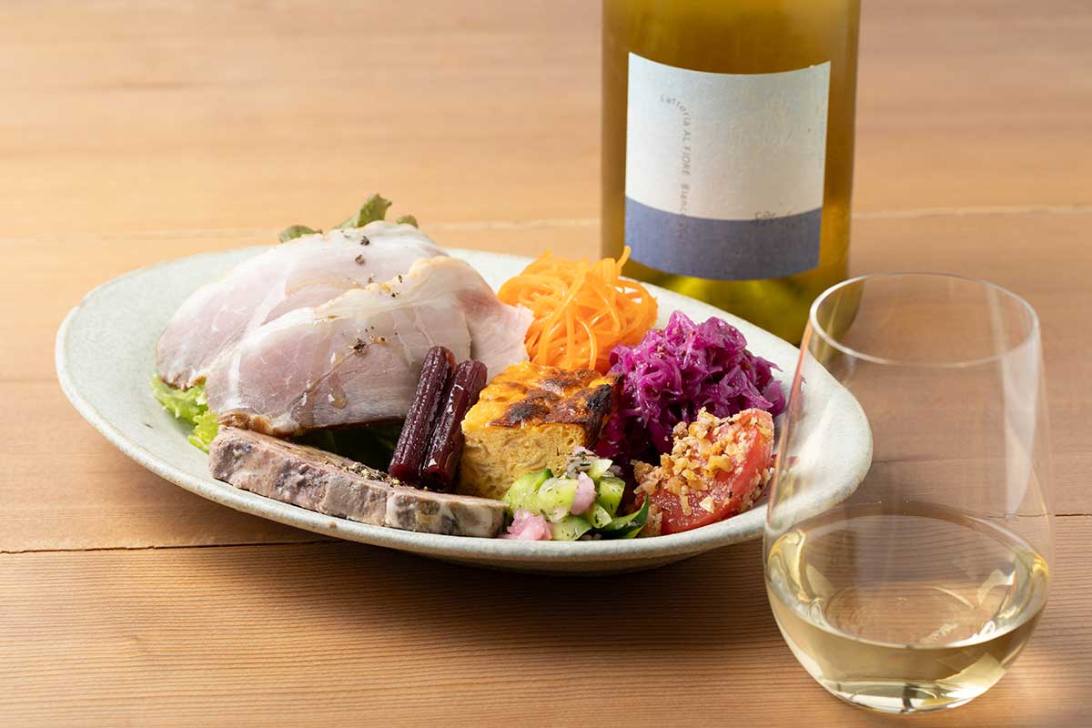 ランチに共通の自家製シャルキュトリと惣菜の盛り合わせ。スモークハムやパテ・ド・カンパーニュ、トマトと胡桃のサラダ、キュウリのサルサヴェルデ、人参ラぺなど。「ファットリア・アル・フィオーレ」の「ビアンコ」(グラス・800円)と。