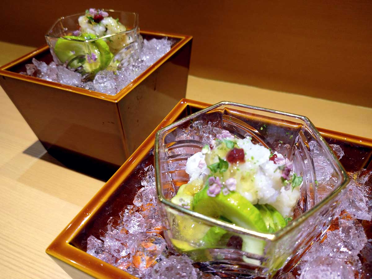 湯引きをしたふわりとした歯触りの鱧と、コリコリとした歯ごたえの白瓜との相性が楽しい「鱧落としと白瓜の雷干し」。