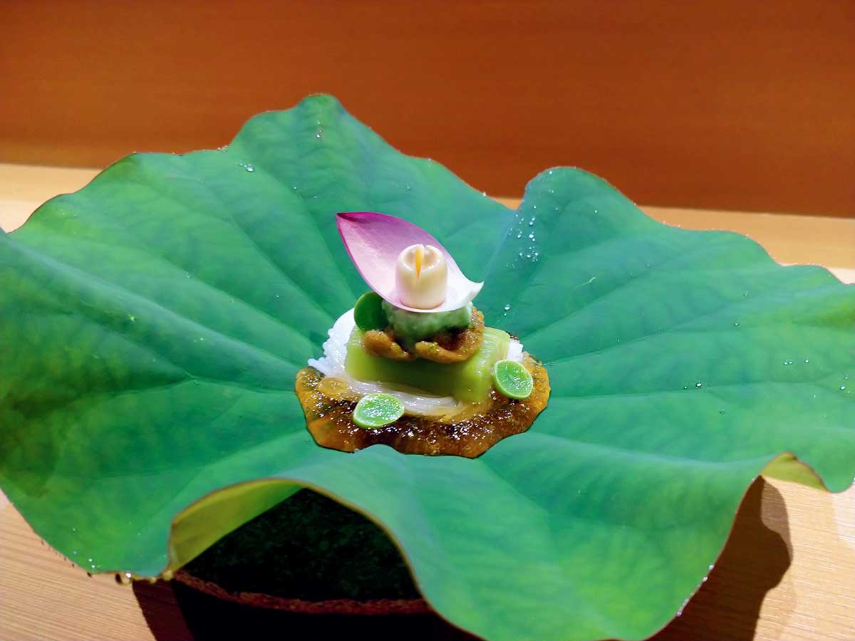 瑞々しい蓮の葉の上に盛り付けた「雲丹、茄子、素麺、琥珀ジュレ蓮盛り」。