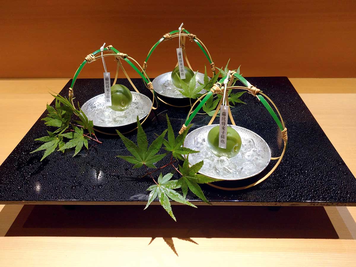 銅鍋を使い白ワインで炊き、青く仕上げた「青梅甲州煮」。