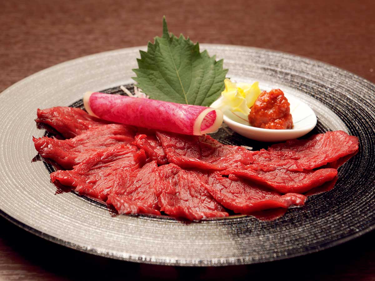 会津名産の馬肉をオリジナルレシピの辛味噌で味わう「桜刺し」は人気の別注料理。