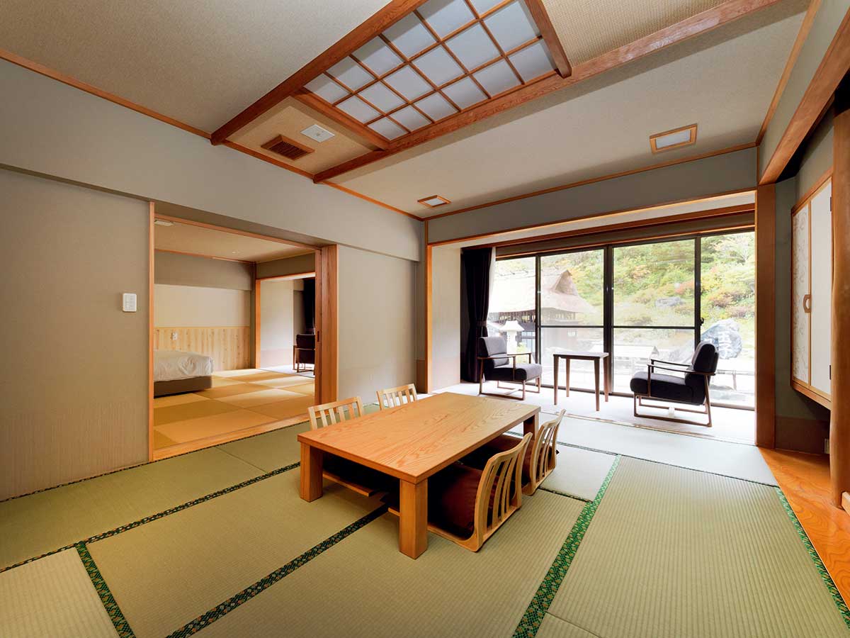 ツインベッドルームに10畳の和室が付いた特別室。茅葺の湯小屋にも最短距離で行ける、人気の一室。