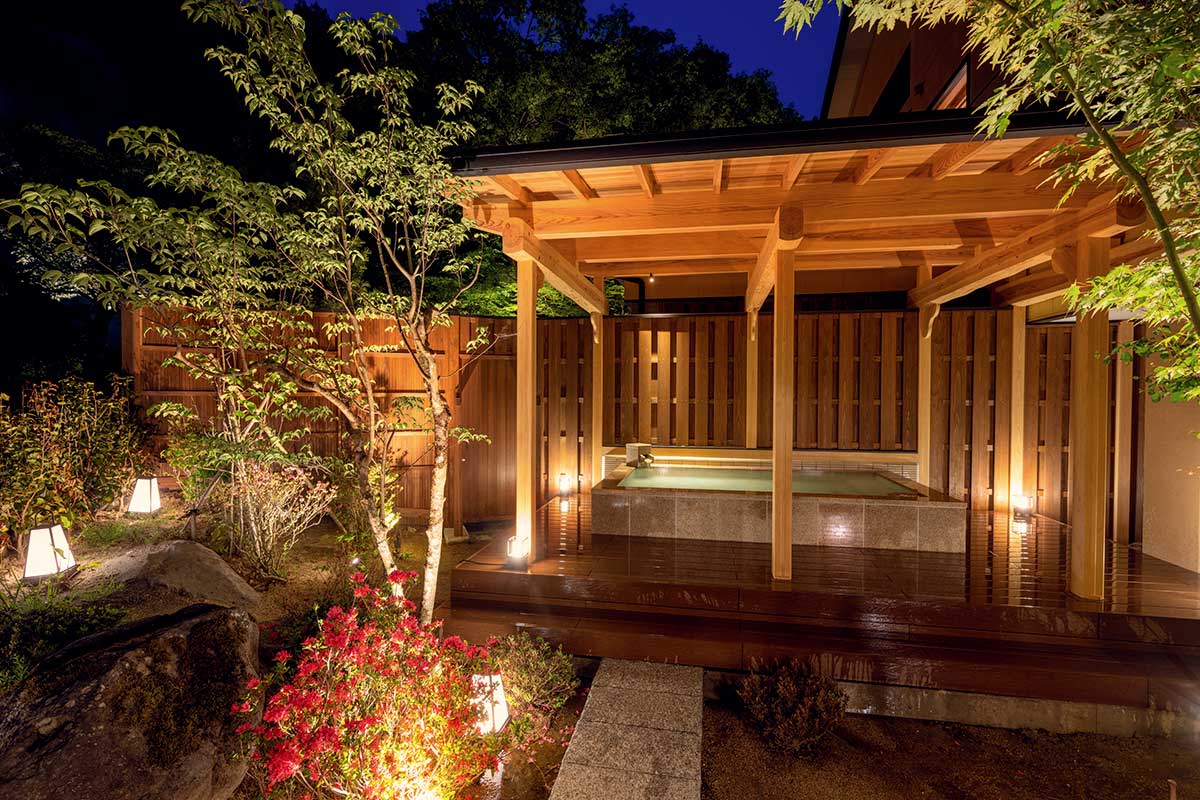 「紫水亭」の客室には、すべてに源泉掛け流しの露天風呂を設置。いつでも温泉が楽しめる。