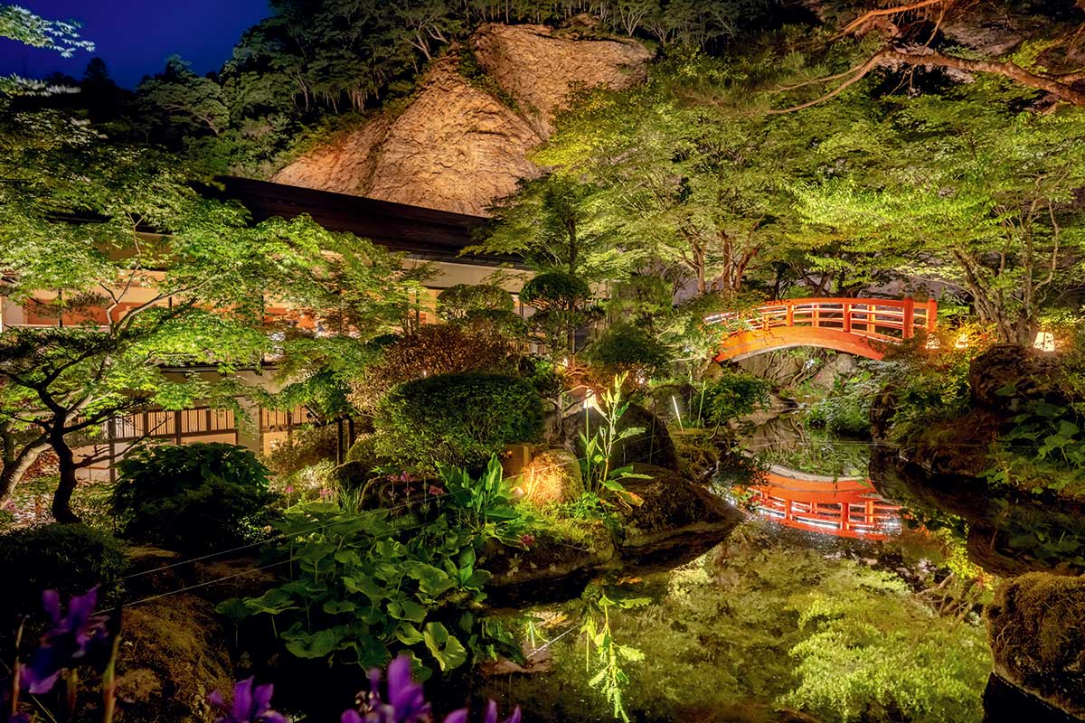 夜にはライトアップされる日本庭園。一般客室の「花鳥苑」からも眺められる。