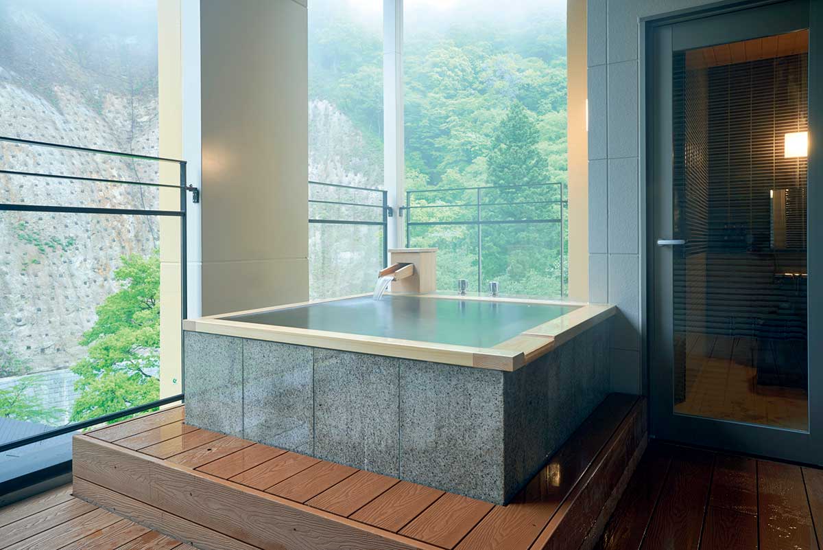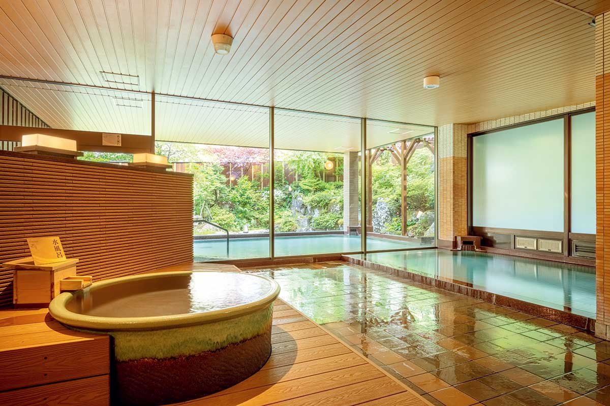 新しくなった「つれづれの湯」と「たまゆらの湯」をはじめ、「太子の湯」「淵の湯」「瀧の湯」と趣の異なる大浴場と5種の貸切風呂で、館内にいながらにして湯めぐりが可能。