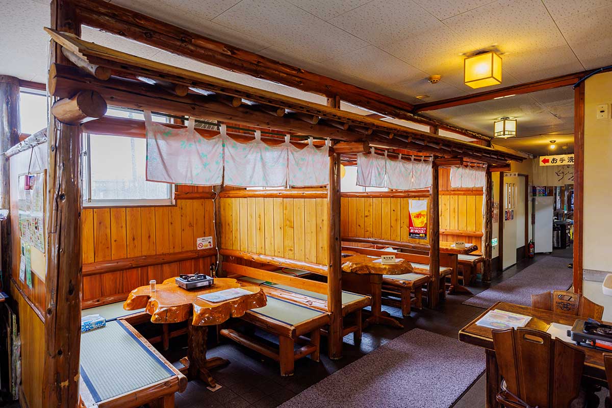 精肉店の奥にあるのが、少人数向けのテーブル席が並ぶ食事処。2階は「一戸」から「九戸」 までの地名をつけた個室になっている。