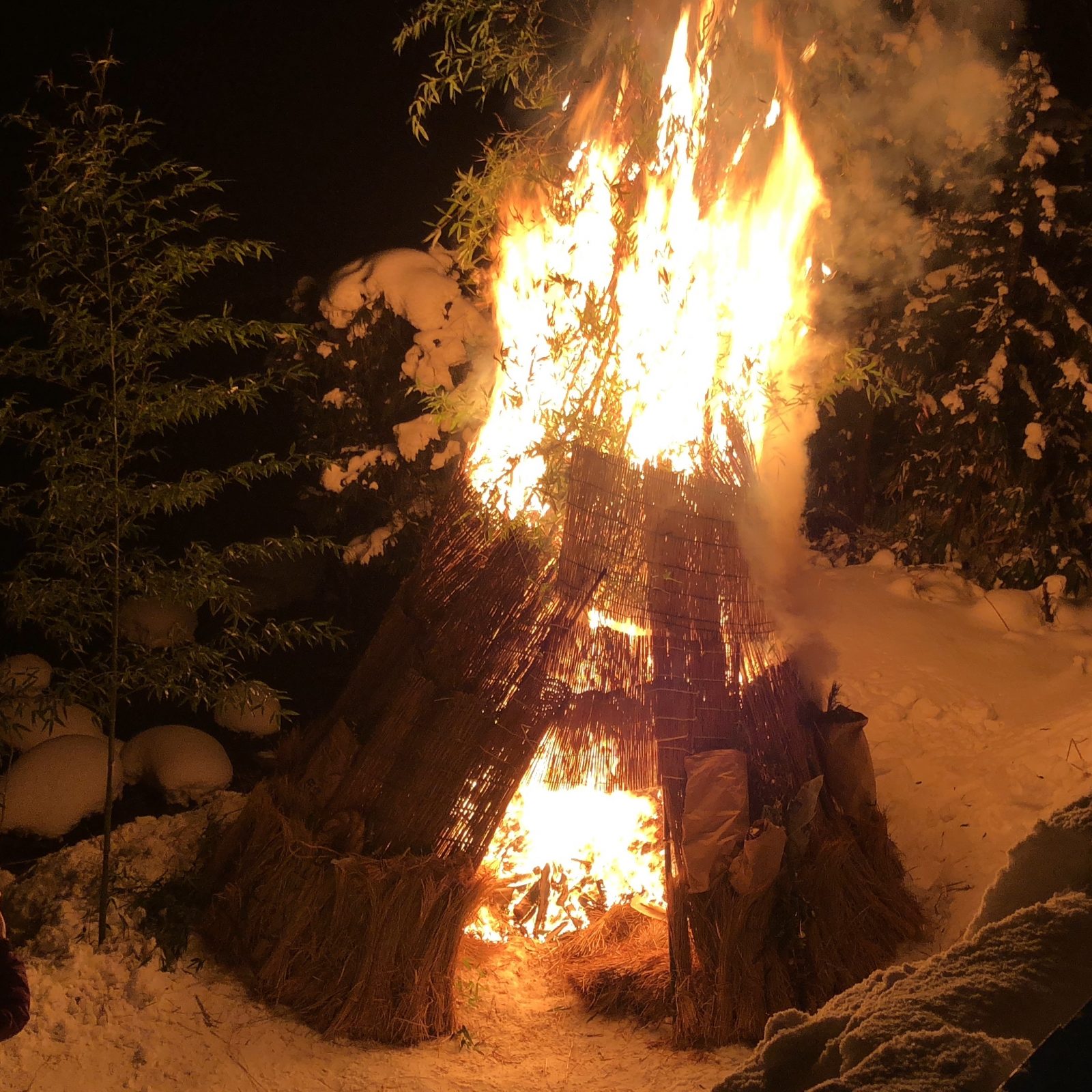 火災除けと五穀豊穣、家内安全、無病息災を願う、八幡地域の伝承行事「さんど小屋」。 小屋を建てるところからスタートし、芸術祭のフィナーレで燃やし尽くす。組み立て体験は21日(土) 10:00から、火入れは22 日(日) 16:50 ごろからを予定。