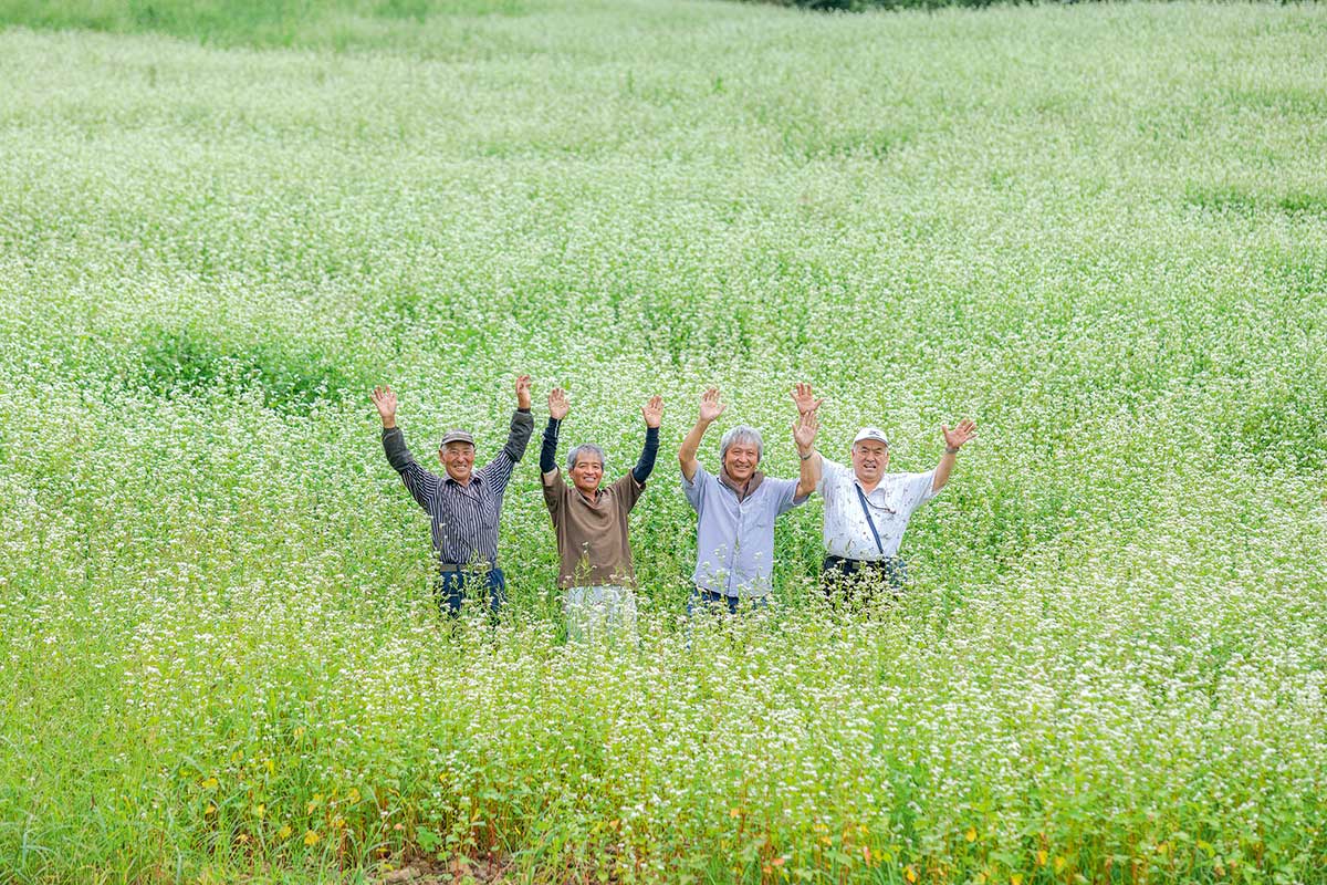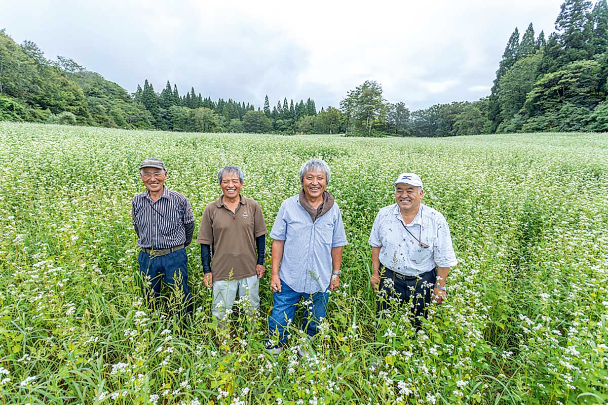 「尾花沢市そば生産振興協議会」立上げ時から「原種最上早生」栽培に取組んできた生産者たち。左から西塚さん、鈴木さん、橋さん、渡辺さん。