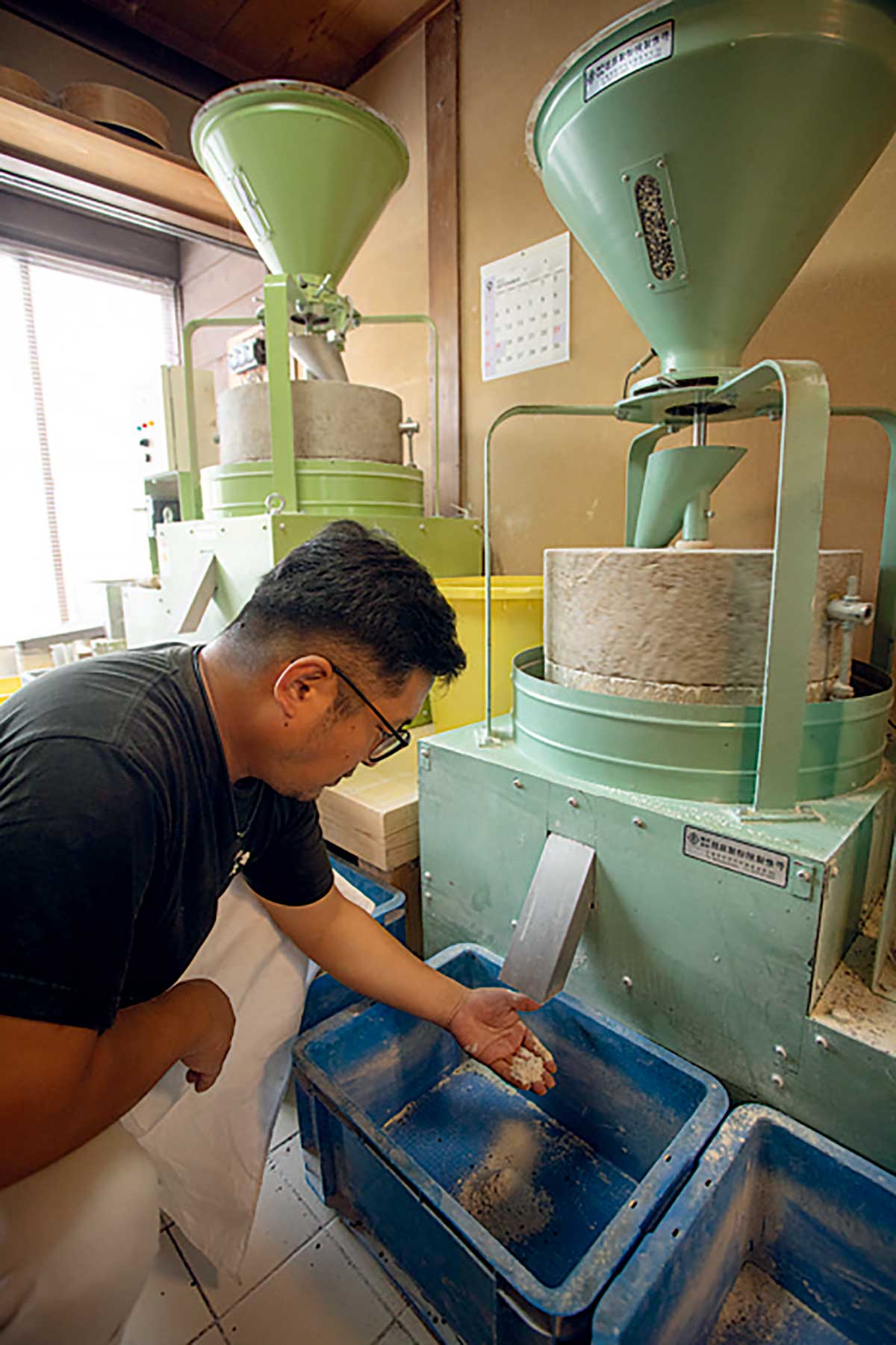 『手打ちそば たか橋』は自家製粉である。農協から仕入れた殻付きの玄そばを、磨きや選別をしてから、石臼2台で製粉している。店で提供するそばは「香りとのど越しの中に野趣も出したくて」殻付きと殻をむいた丸抜きを、ブレンドして挽いているのだそう。店ではそば街道加盟5軒分の粉を挽いているので、2台の石臼はフル稼働だ。