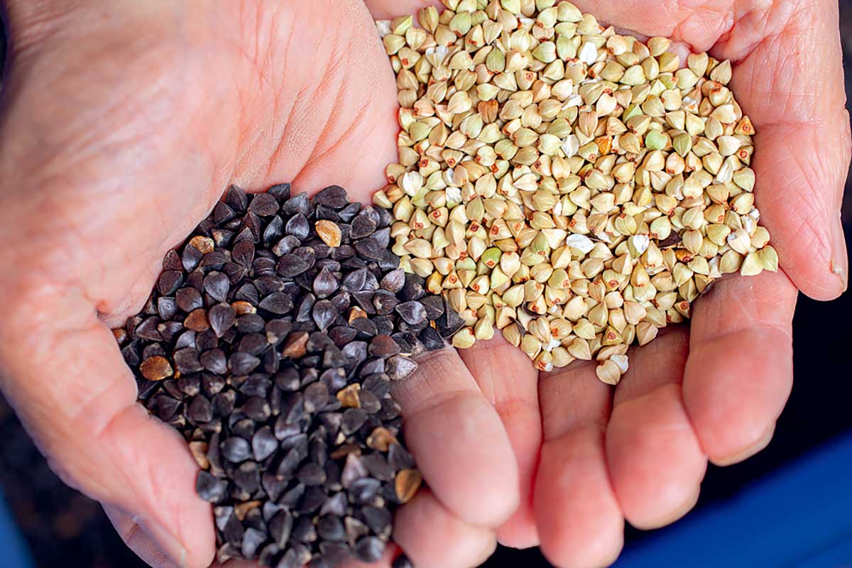 左が殻付きの「玄そば」、右が殻をむいた「丸抜き」。田舎そばは玄そばで製粉するので、そばの色が黒い。
