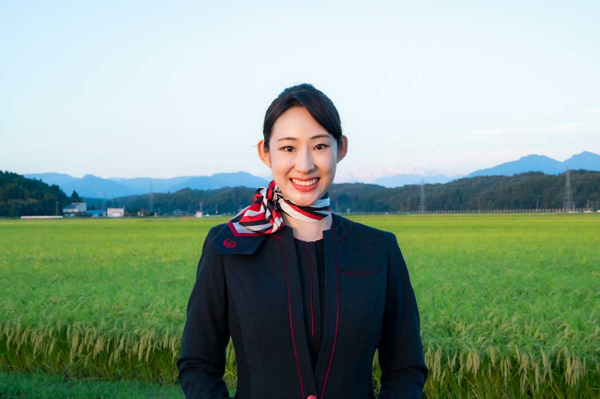 JALふるさとアンバサダー 小川良美さん。新潟県新発田市生まれ、埼玉県育ち。2015年日本航空入社。客室乗務員として乗務をする中で、ゆかりのある新潟県のために仕事をしたいという思いを持って、社内公募でJALふるさとアンバサダーへ応募。2022年4月より新潟県へ移住。地域貢献・地域活性化を目指して活動中。※JALふるさとアンバサダーとは自身の故郷やゆかりのある地域に移住し、培ってきた知見を活かして地域の生産者さまや事業者さま、自治体さまとご一緒に地域資源を活用したコンテンツの創出や商品開発など地域課題の解決に向けて活動する現役客室乗務員のこと