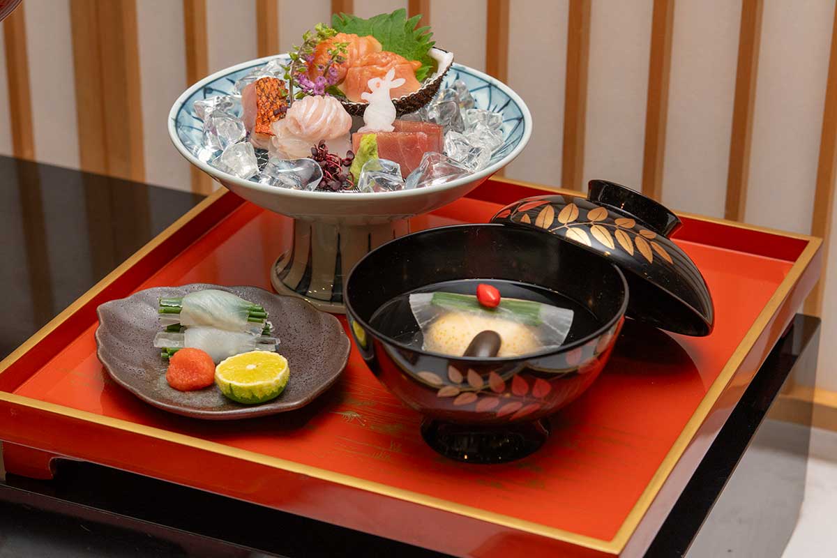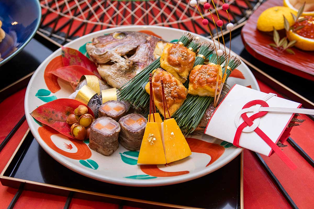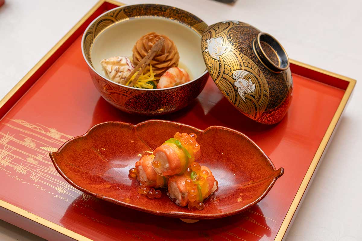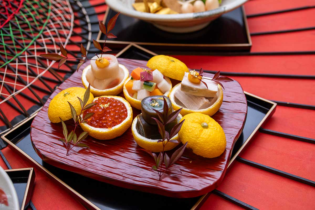 この日は、鮮やかな朱色の和傘を器に見立てた、お正月料理が中心に。