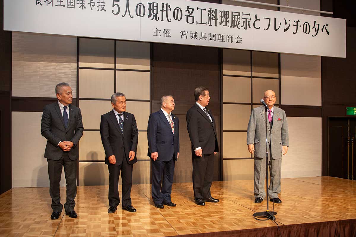続いて紹介されたのは、今回の料理展示を行った5名の現代の名工たち。右から、佐藤敏男さん、及川健一さん、髙橋正行さん、鹿野佐一さん、羽田満さん。