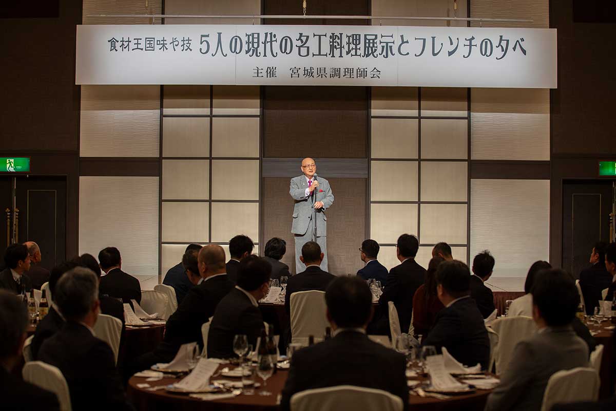 冒頭、会を代表してあいさつをした佐藤会長は、コロナという厳しい時期を乗り越えあらためて賞味会を開催できた喜びと共に「宮城県は全国でも料理人のレベルが高いと言われている。今年行われた全国日本料理コンクールでは宮城県が全国最多の4名の大臣賞を受賞するなど、料理人のレベルが認められてきている」と挨拶をし、今回の賞味会など日々の活動を通して、宮城県の食文化の発展への想いを語りました。
