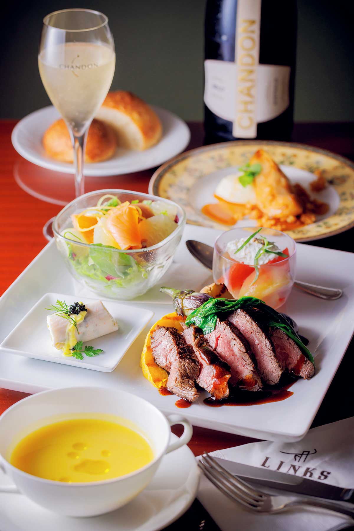 メイン、スープ、自家製パンなどがセットの「土・日・祝日のランチ」(2310円)。土・日曜、祝日限定でスパークリングワインを用意。