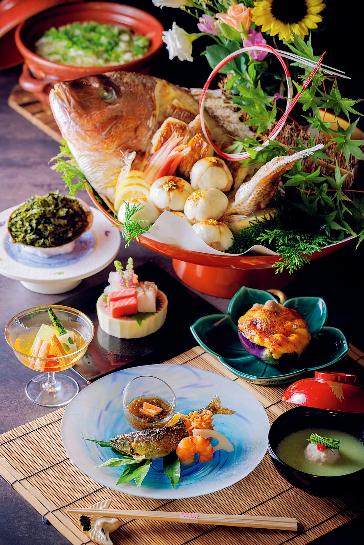 先付、前菜、お造り、鯛の姿焼きなど月替りの8品が堪能できる「良縁懐石」(1万2100円)。