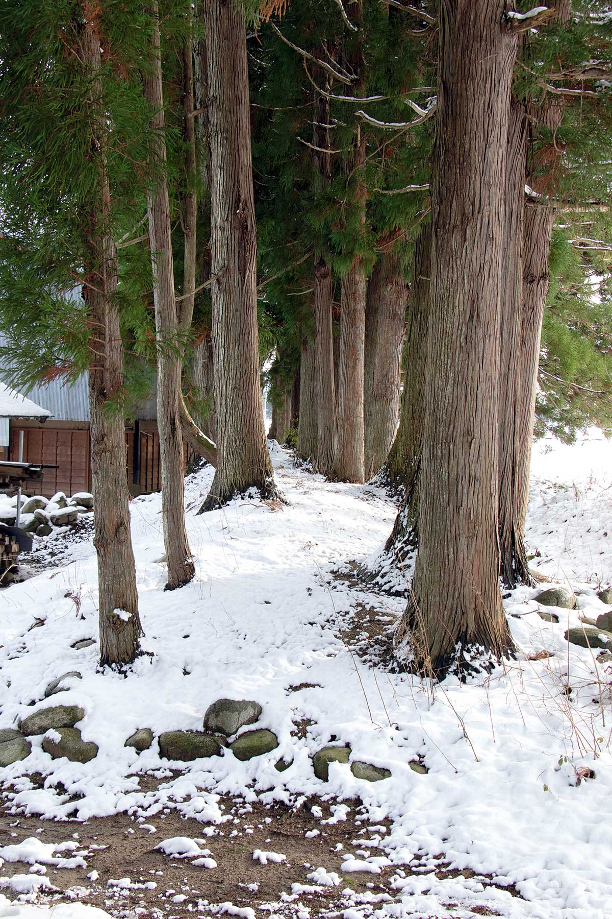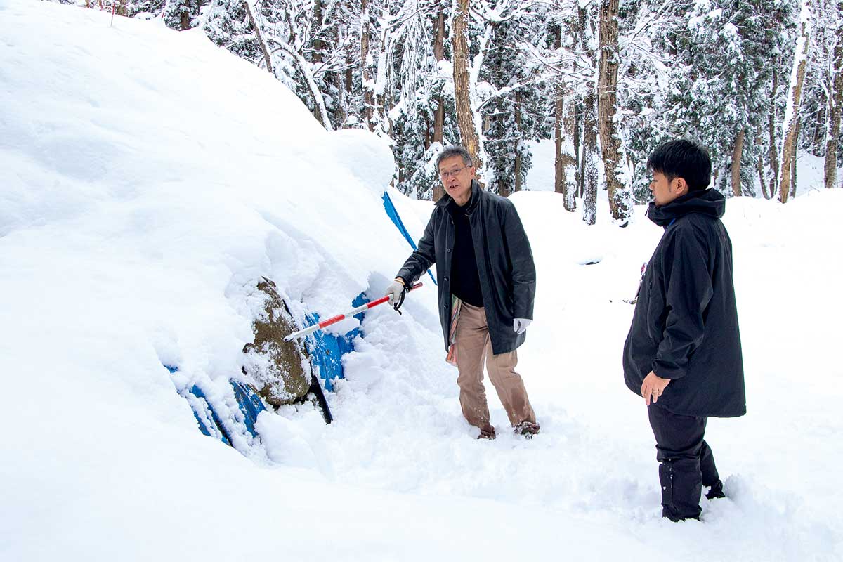 取材で舘山城を訪れた日は、この冬最初の大雪。40cmほどの積雪があったが、本丸入り口の屈曲や石積みをはっきりと見ることができた。