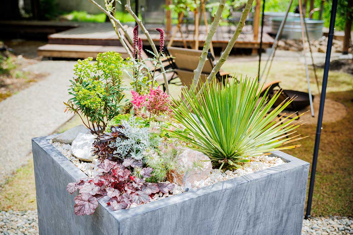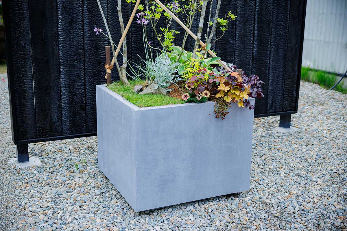 マットなカラーリングと直線的なデザインに、みずみずしい草花が映えるモルタル調仕上げ。