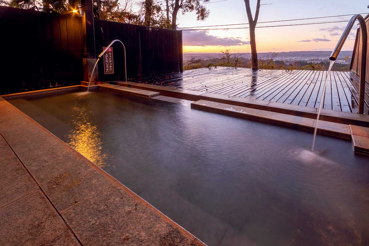 別館『山桜 桃の湯』は17の風呂を有する温泉施設。写真は一関市街を望む天空風呂。『果実の森』とつながっているので、ゆったりと湯めぐりが愉しめる。