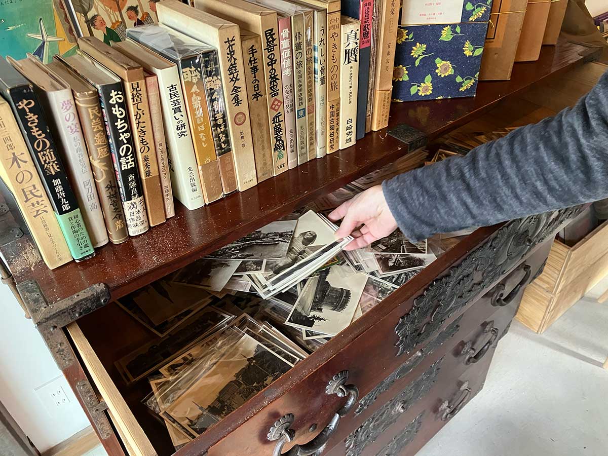 仙台箪笥の引き出しに、国内外のアンティーク絵葉書や、なつかしのめんこなどをディスプレイ。