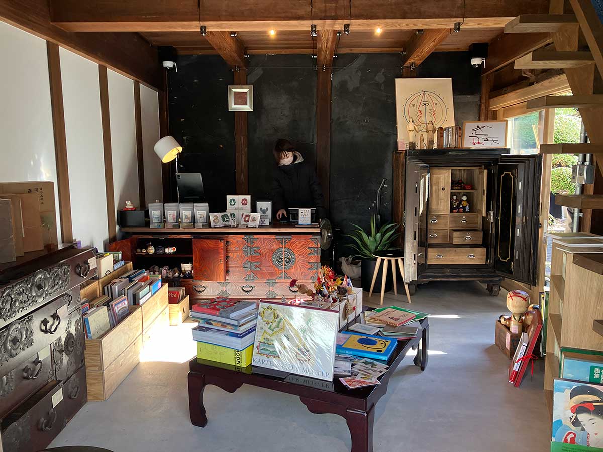 古本のほか、建物のイメージに合わせてセレクトした民芸品やアンティークの絵葉書、郷土玩具などを販売する。