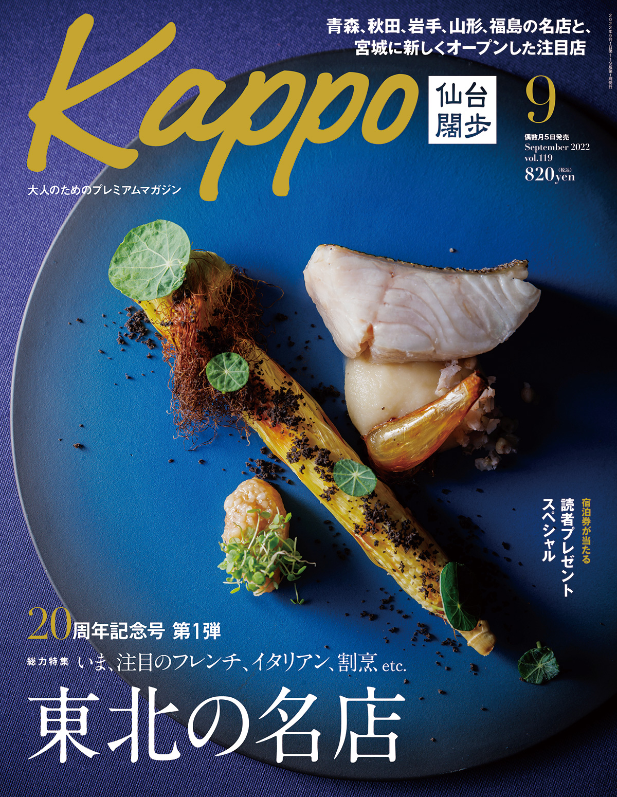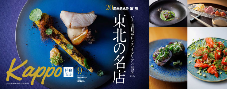 8月5日発売の9月号は、創刊20周年記念号第一弾。特集は、いま、東北で注目のイタリアンやフレンチ、割烹料理店など、Kappo初掲載店を中心に編集部が総力を上げて取材した「東北の名店」です。